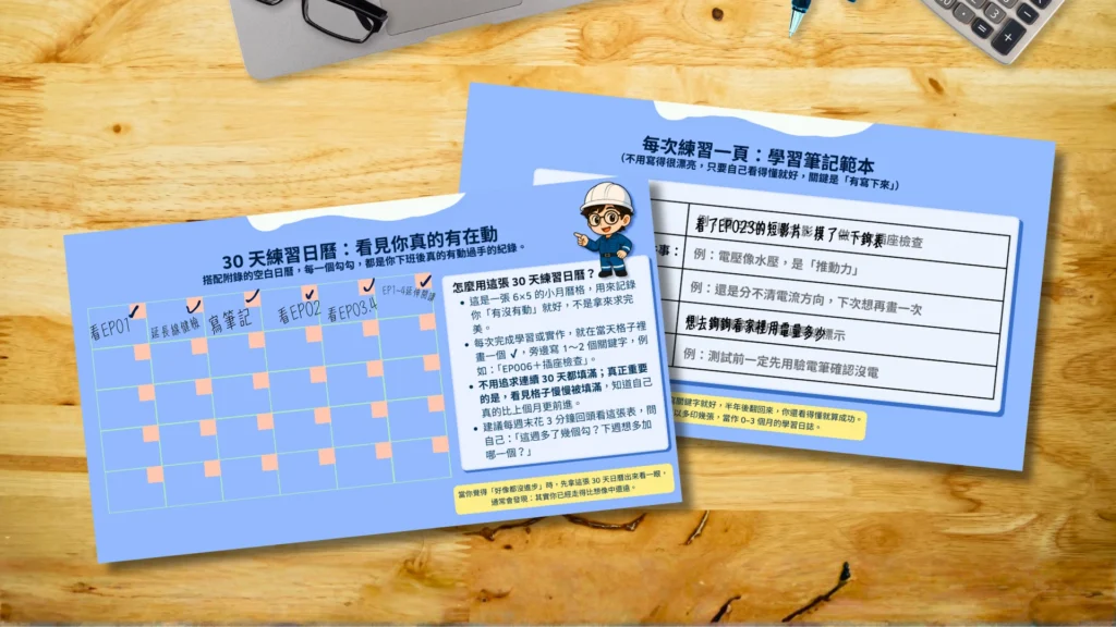這本《轉職電工入門包:0–3 個月行動手冊》,就是幫你用三個月、下班後的零碎時間,繞完「轉職電工第一圈」的實驗計畫。